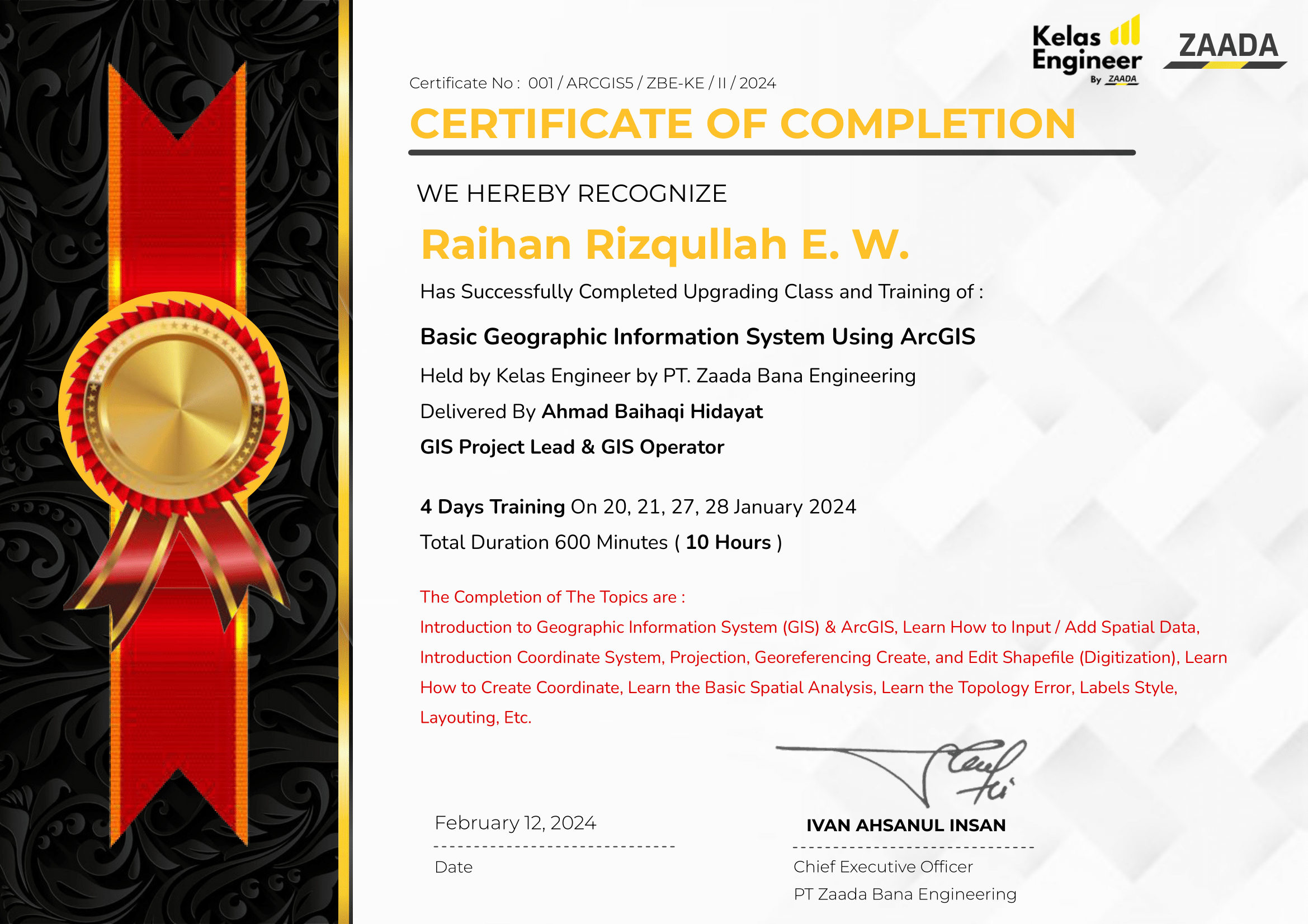 Completed Basic Geographic Information System Using ArcGIS training from Kelas Engineer by PT. Zaada Bana Engineering. This comprehensive 4-day training (10 hours total) provided hands-on experience with ArcGIS software and fundamental GIS concepts for spatial data analysis and map creation.